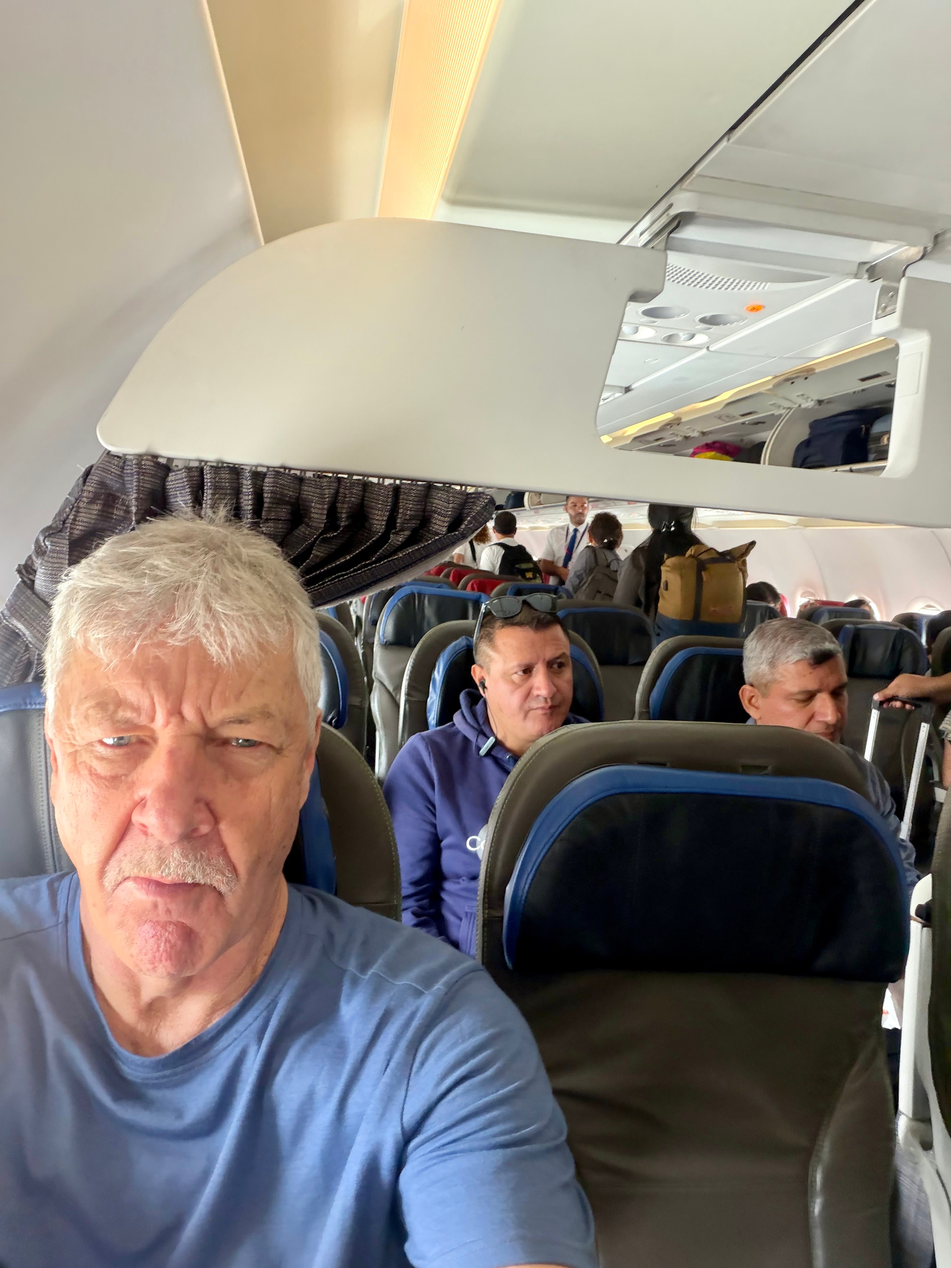 Somehow, I had booked a “premium” seat in the front of the plane with a blocked middle seat. A LOT of room to stretch out and premium service from the staff for those eight seats. I looked forward to seeing the mountains and forest go by but it was cloudy so I had a short nap instead.